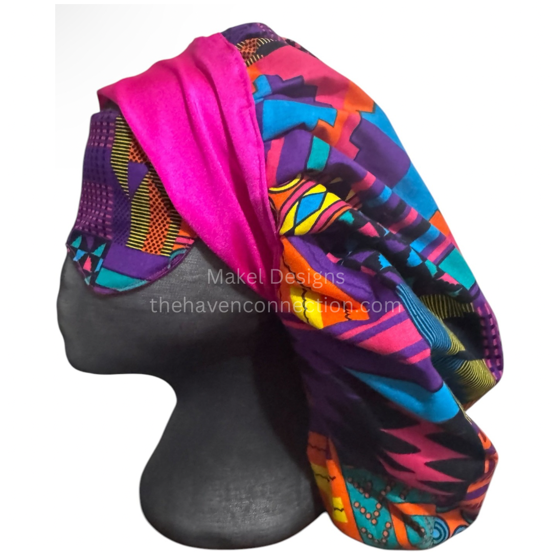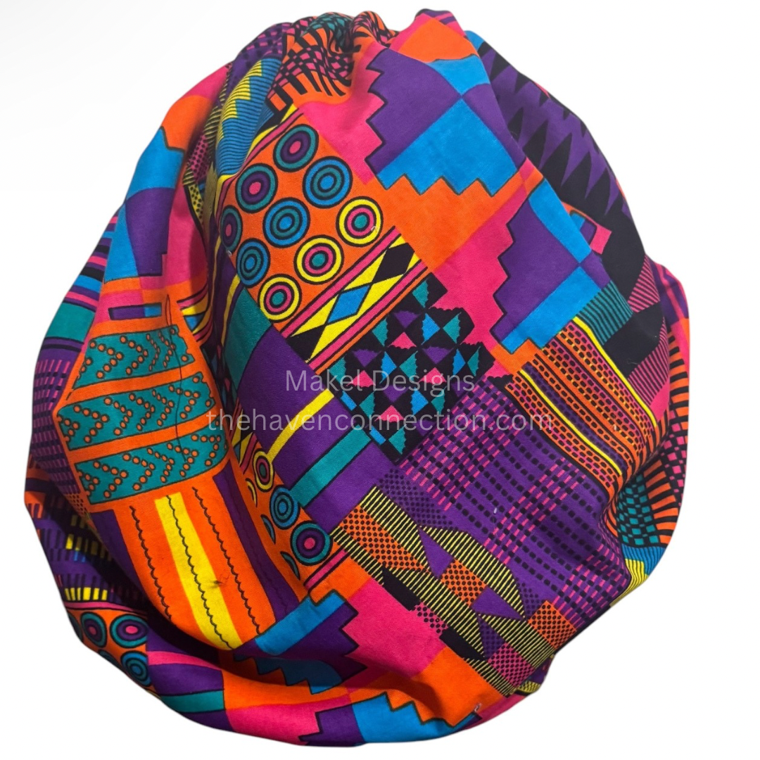 Elevate your hair care, home and me-time routine with the BONITA Ankara Bonnet. It is a perfect fusion of style and functionality. The exterior showcases vibrant African Ankara fabric, while the interior and headband are lined with soft, four-way stretch material for a secure and sleek fit. Made to order 18 stunning prints, this bonnet is perfect for every occasion. Want a personalized touch? Choose from over 40 additional prints for custom orders. Designed to protect your hair and add flair to your look, the BONITA Ankara Bonnet is a must-have accessory for natural hair enthusiasts and style lovers alike.